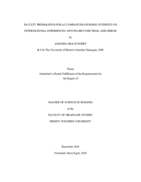 Many Canadian nursing programs offer international experiences (IEs) as educational opportunities for students. While evidence of pre-departure preparation exists for students, little is known about the preparation of faculty who accompany them. In this qualitative study, semi-structured interviews were conducted with nine novice-to-expert nursing faculty to explore faculty preparation for accompanying nursing students on IEs. The interpretive description design was informed by critical inquiry methods which examined preparation alignment with critical global perspectives. Four themes were interpreted including: the overarching theme of gaining preparation expertise over time, and three main themes of learning on-the-job, discovering the different responsibilities, and learning for-the-job. In the findings, experience was emphasized over formal preparation. Additionally, preparation was complicated by a lack of global health knowledge and a lack of institutional support. Recommendations include moving beyond learning from trial-and-error and moving towards intentional preparation that better considers the experience, knowledge, skills, and attitudes for preparing nursing faculty for IEs. |