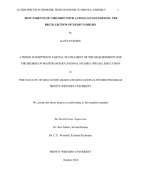 Autism Spectrum Disorder has an increasing prevalence in children; diagnostic tools have become more refined and children are diagnosed younger. Parents of children with ASD learn to cope with challenges. It was hypothesized that many parents in the lower mainland of British Columbia are self-educating instead of learning from healthcare professionals. It was also hypothesized that parents are unaware of the resources available to them after receiving a diagnosis, and are therefore seeking help for their child and assembling services in much the same way they self-educated themselves. Eight families were interviewed about their experiences post-diagnosis. It was observed that families varied greatly in emotional response and were provided with information from a physician. However, few actually used the information provided to achieve a service assembly. This qualitative research revealed that families experience relational strain and parents desired a resources to guide, support, and educate them throughout their autism journey. |