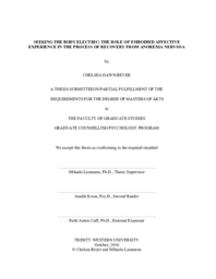 Anorexia nervosa (AN) is presently defined by restriction of energy intake, low body weight, fear of gaining weight, and disturbances in body image (American Psychological Association, 2013). Absent from the current framework of AN is the acknowledgement of embodied and lived experience. Alternatively, the Developmental Theory of Embodiment (DTE), founded on Merleau-Ponty’s conceptualization of embodiment, proposed that AN develops from complex interactions between the embodied female self and the sociocultural context in which it is situated (Piran & Teall, 2012). Extending from the framework of the DTE, the purpose of the study was to explore the role of embodied and affective experience in women with AN through the process of recovery using body-centered poetic discourse as a method of inquiry. Six women diagnosed with AN reflected on three time points of their recovery journey: at the worst of the eating disorder, in recovery, and towards unified body-self. Thematic analysis of poetic discourse resulted in the identification of eleven embodiment and three affective themes. Moreover, three body-self patterns emerged from the AN recovery process: bifurcated, recovered, and unified body-self. With recovery from AN, poetic discourse displayed a pattern of shifting from negative embodied experience to positive embodied experience. The change in the affective experience was intertwined with that in the embodied experience, likewise shifting from negative or absent to positive. Findings illustrated recovery from AN as parallel to the restoration of embodied lived experience. The clinical and societal implications of these findings are discussed in terms of reforming conceptualization and prevention of AN. |